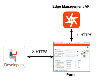 Wenn Sie Ihr Portal erstellen, müssen Sie als Erstes die URL der Edge-Verwaltungs-API. Je nachdem, wie die Edge-Verwaltungs-API konfiguriert ist, wird diese URL TLS verwenden können. Weitere Informationen finden Sie unter Erstellen ein Entwicklerportal. - Für die Kommunikation zwischen Entwicklern und dem Portal.