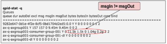 qpid-stat -q command并检查 msgIn 和 msgOut 列值。 - 以下示例输出表明 msgIn 和 msgOut 不相等。这表示