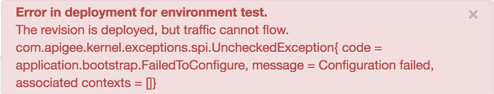 "server" : [ { "error" : "com.apigee.kernel.exceptions.spi.UncheckedException{ code = application.bootstrap.FailedToConfigure, message = Configuration failed, associated contexts = []}", "status" : "error", "type" : [ "message-processor" ], "uUID" : "0a20926c-f4bf-401b-af84-05fd84b9f492" }, { "error" : "com.apigee.kernel.exceptions.spi.UncheckedException{ code = application.bootstrap.FailedToConfigure, message = Configuration failed, associated contexts = []}", "status" : "error", "type" : [ "message-processor" ], "uUID" : "f2ee6ab4-a108-4465-a7ba-b56530d8e3fc" }, { "error" : "com.apigee.kernel.exceptions.spi.UncheckedException{ code = application.bootstrap.FailedToConfigure, message = Configuration failed, associated contexts = []}", "status" : "error", "type" : [ "message-processor" ], "uUID" : "0f41991e-b310-4e77-aac5-5fdb150ef9f6" },デプロイ ステータス出力の各 Message Processor に "Configuration failed" というエラー メッセージが表示されます。