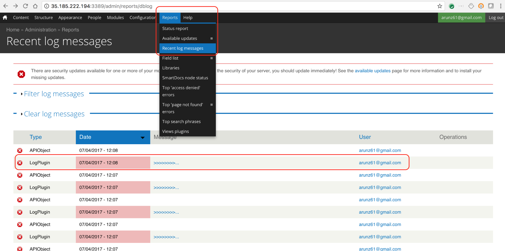 - 转到报告 ->近期日志 信息。