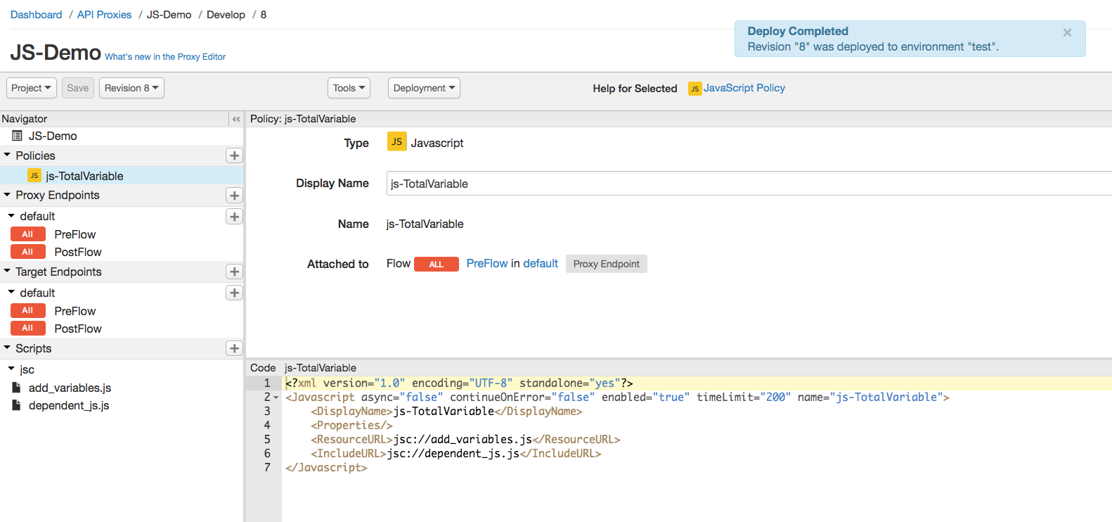 dependent_js.js. In the below screenshot, notice that the file specified as a resource URL in the policy does not appear in the Scripts section. Therefore, it is not part of the API Proxy. If it is also the case that the file does not exist at the organization or environment level, the deployment of the API Proxy fails with the error:Invalid resource url ref jsc://dependent_js.js in policy js-TotalVariable in aprabhashankar-eval