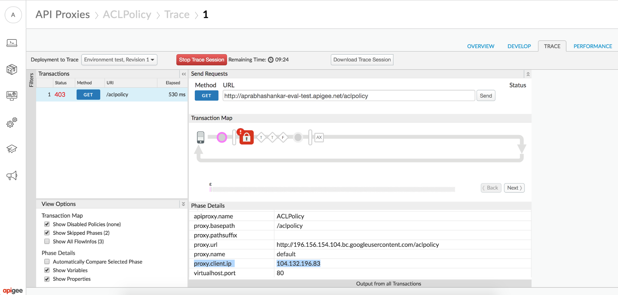 proxy.client.ip(comme illustrée à la capture d'écran de la trace ci-dessus) correspond à l'adresse IP définie dans l'élément<SourceAddress>de la règle de contrôle d'accès AccessControl, déclenchant ainsi la réponse d'erreur :"faultstring": "Access Denied for client ip : 104.132.196.83"