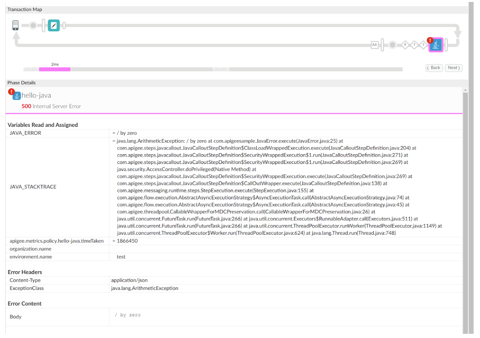 In questo esempio, il criterio JavaCallout non è riuscito a causa di un'eccezione ArithmeticException (divisione per zero) nella riga 25 del file