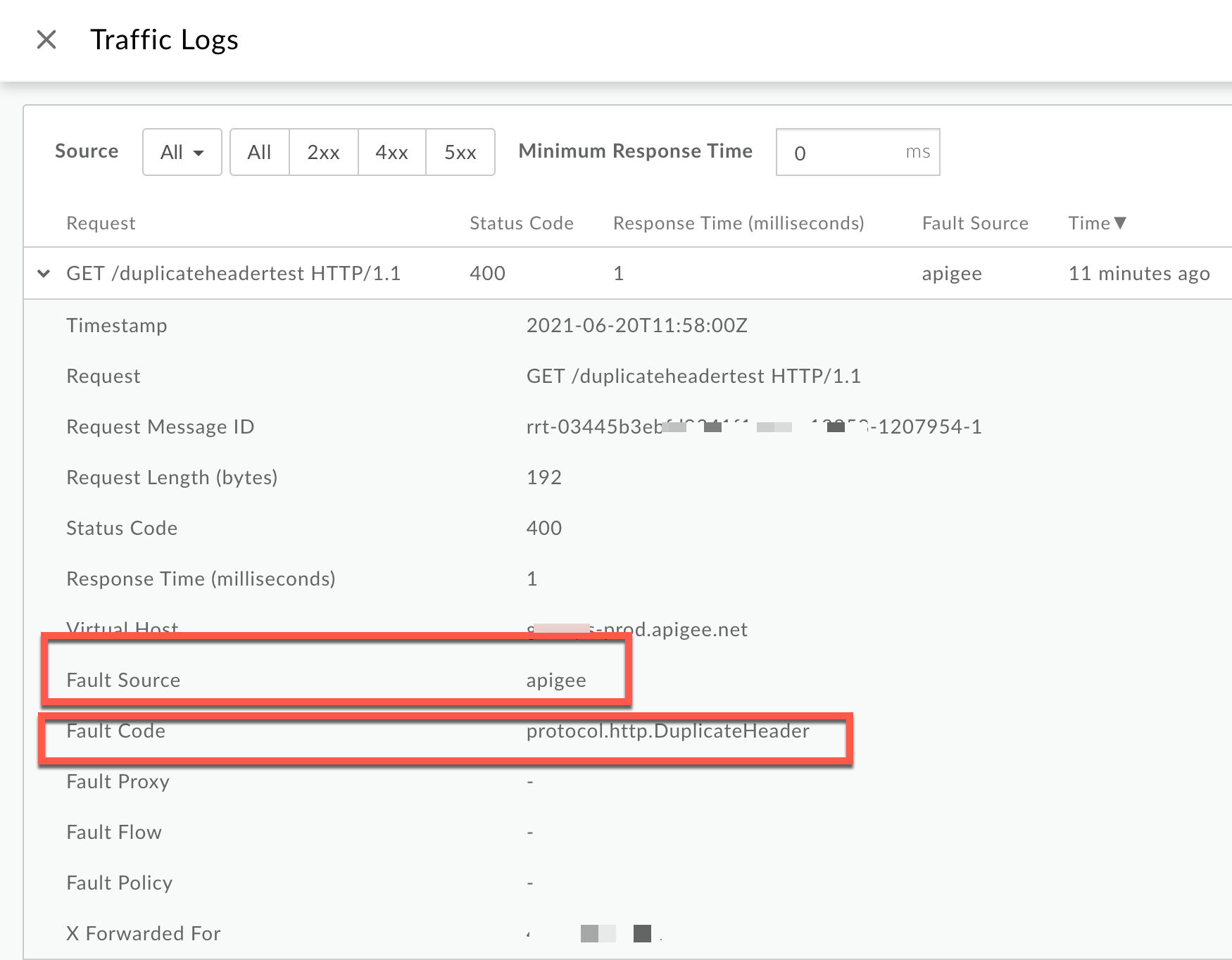 400錯誤 與protocol.http.DuplicateHeader的值相符,然後 判斷 X-Apigee-fault-source. 的價值。NGINX 存取記錄中的 400 錯誤示例: