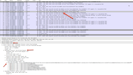 - El router envía el mensaje “Server Hello” en el paquete 35 y, luego, envía su certificado y, además, solicita a la aplicación cliente que envíe su certificado en el paquete 38.