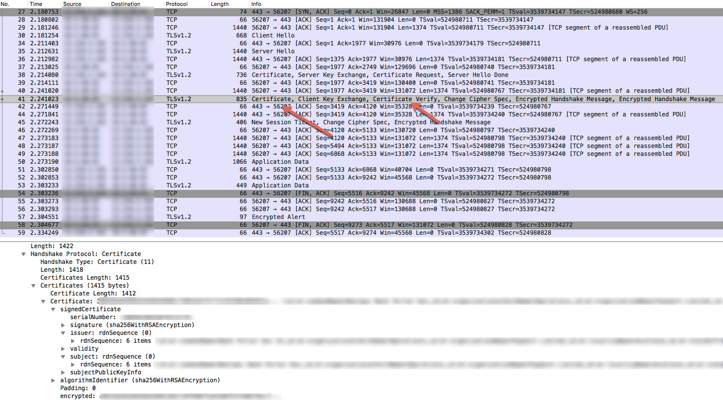 La aplicación cliente envía su certificado en el paquete n.o 41. Consulta el Certificado Verificar del paquete 41 y determinar el certificado que envía la aplicación cliente.