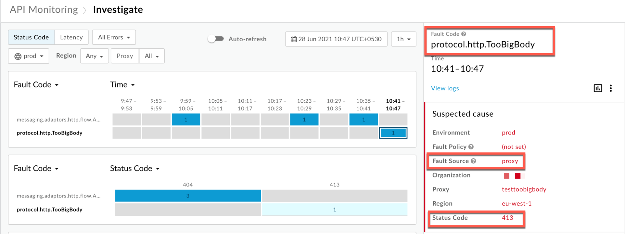 - You may select the Proxy filter to narrow down the fault code.