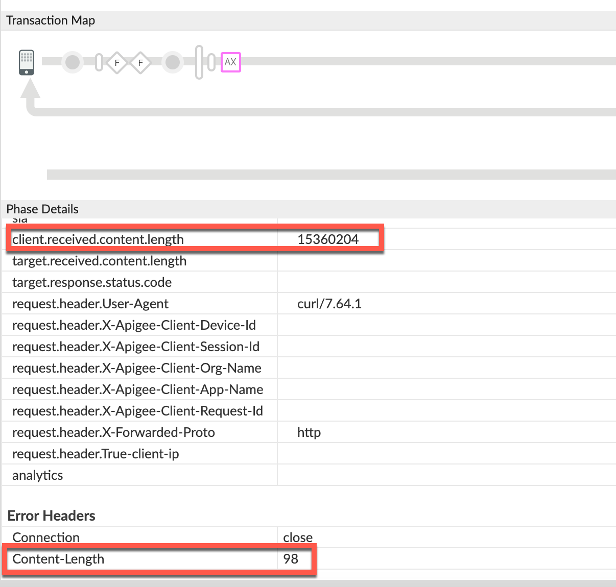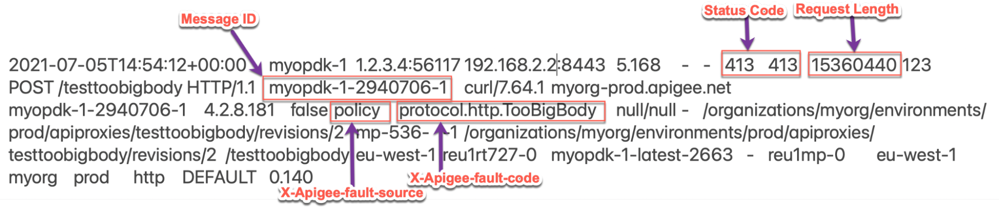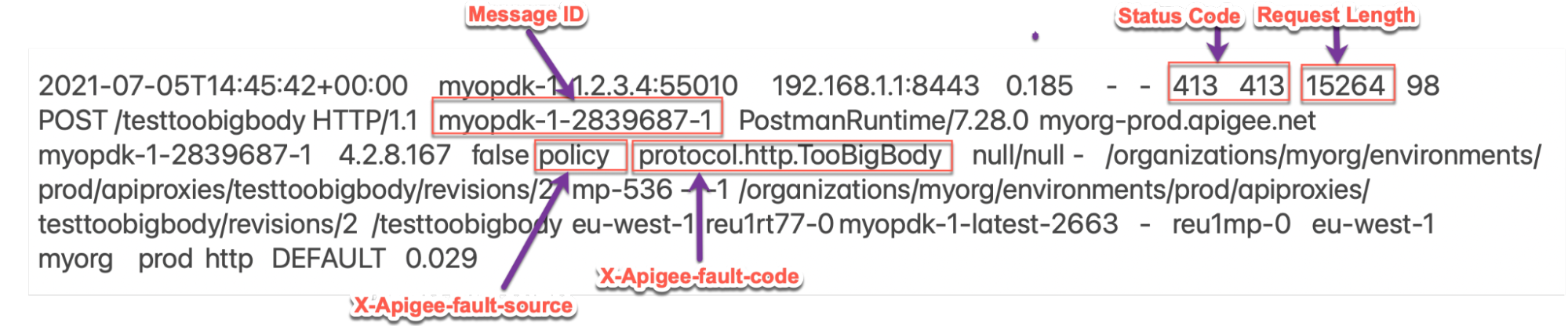 - Determine the Fault Code, Fault Source, and Request Payload size for the error observed using API Monitoring, Trace Tool, or NGINX Access logs as explained in Common diagnosis steps with Scenario #2 (compressed).