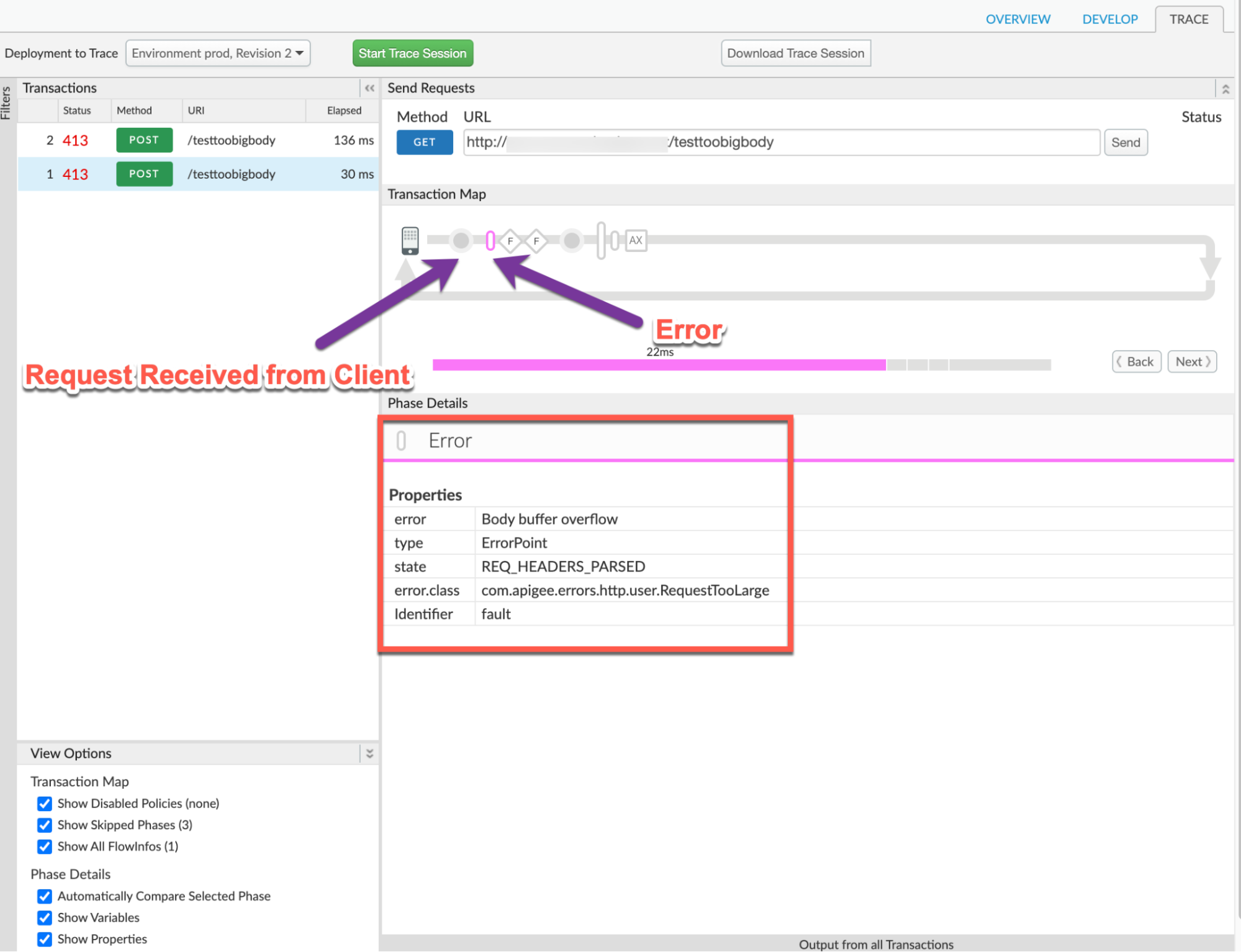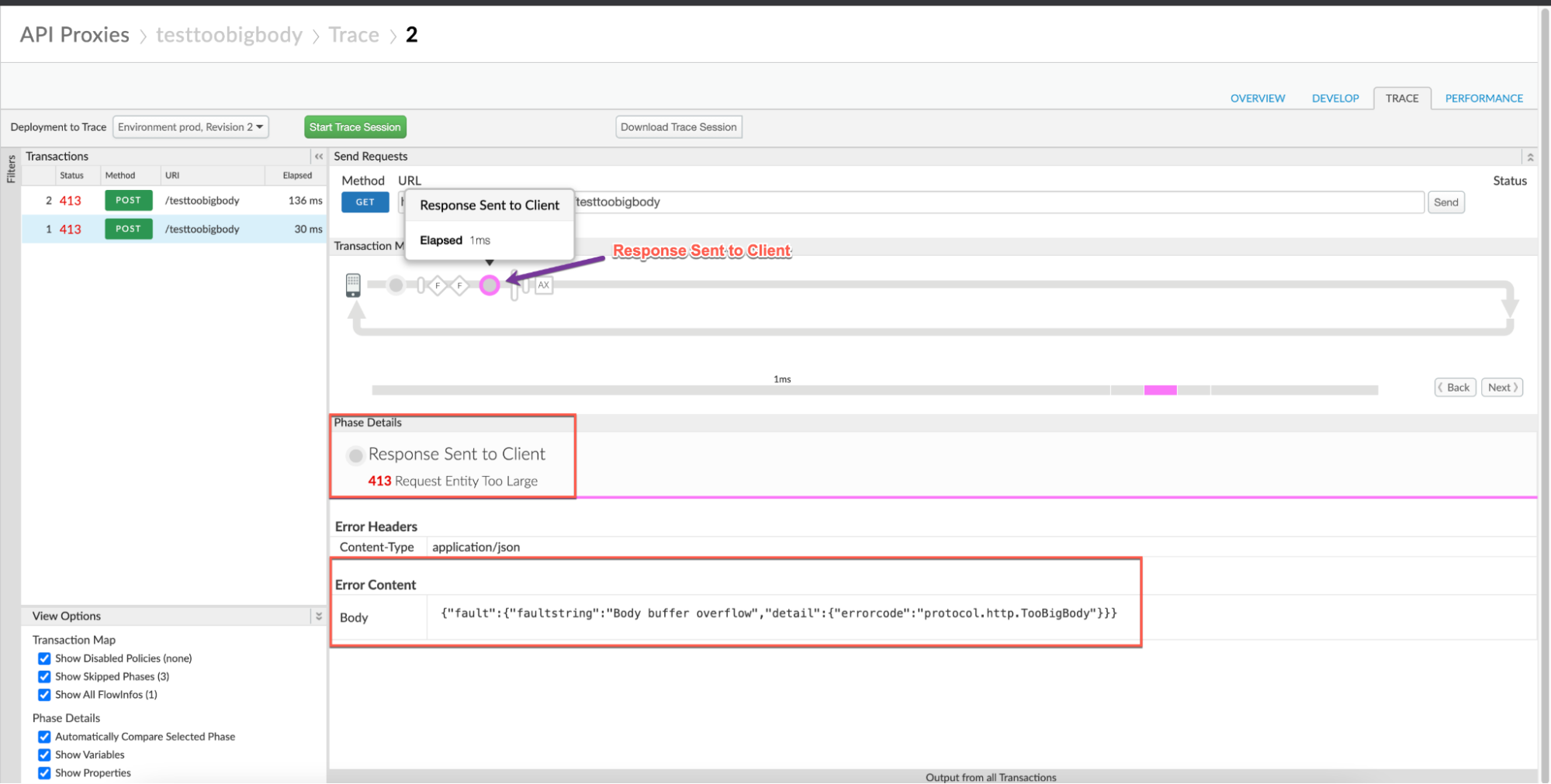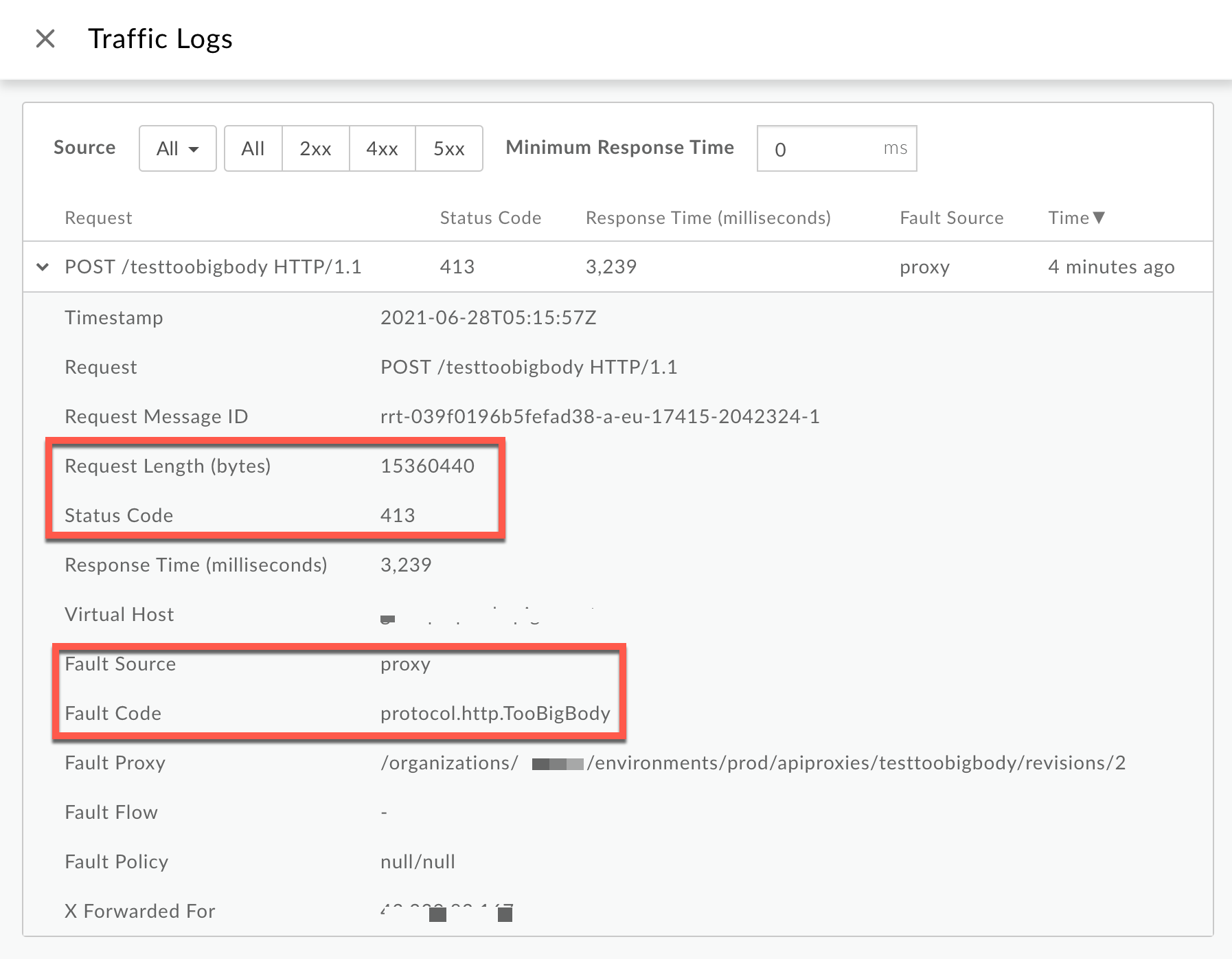 proxy, the Fault Code has the valueprotocol.http.TooBigBody, and the Request Length is less than 10 MB, then it indicates that the HTTP request from the client has a request payload size lower than the allowed limit in its compressed format, but the payload size is greater than the allowed limit when uncompressed by Apigee. - Status Code: