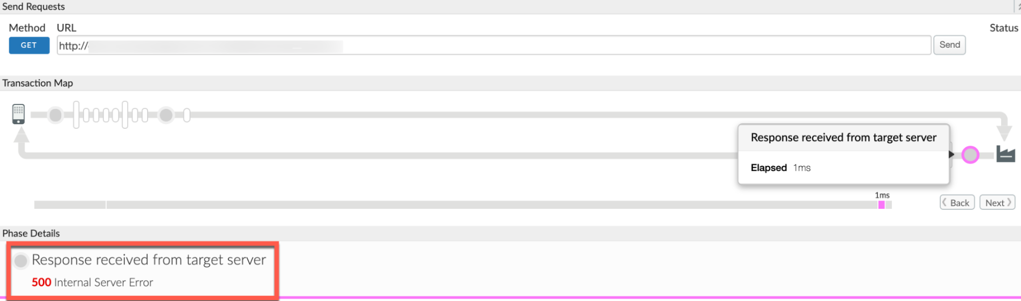 سيظهر الخطأ عادةً في مسار بعد الردّ الذي تم تلقّيه من الخادم الهدف. كما هو موضح أدناه: