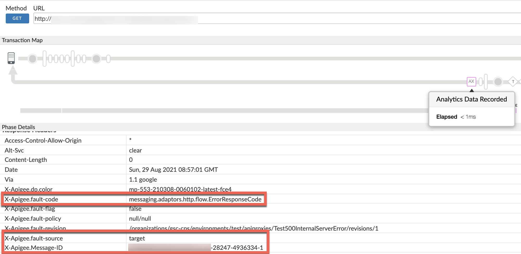 Scroll down to the Phase Details Response Headers section and determine the values of X-Apigee-fault-code and X-Apigee-fault-source, and X-Apigee-Message-ID as shown below: