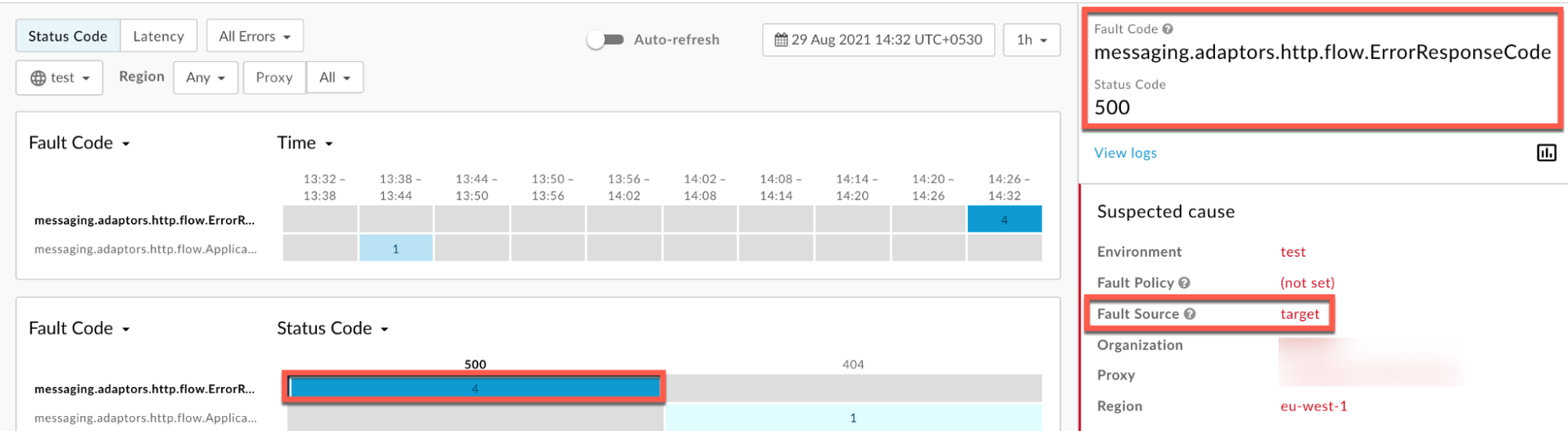 targetand Fault Code ismessaging.adaptors.http.flow.ErrorResponseCode, then that indicates that the error is returned by the backend server. - You can use one of the following steps to diagnose the cause of the issue: