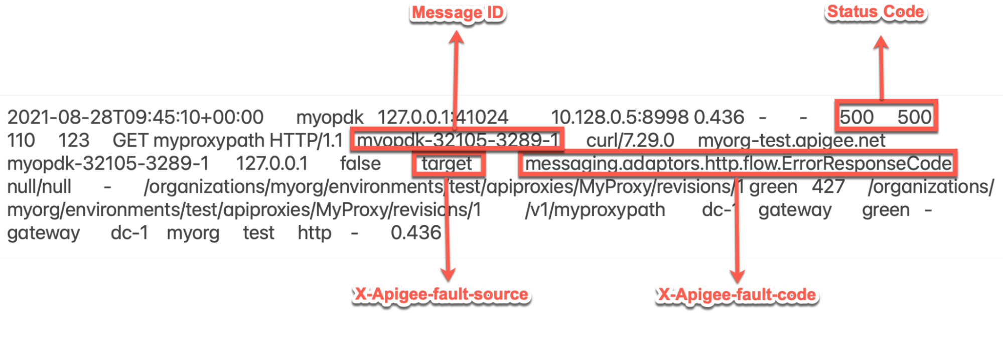500errors with the X-Apigee-fault-code matching the value ofmessaging.adaptors.http.flow.ErrorResponseCode, then determine the value of the X-Apigee-fault-source.Sample 500 error from NGINX access log: