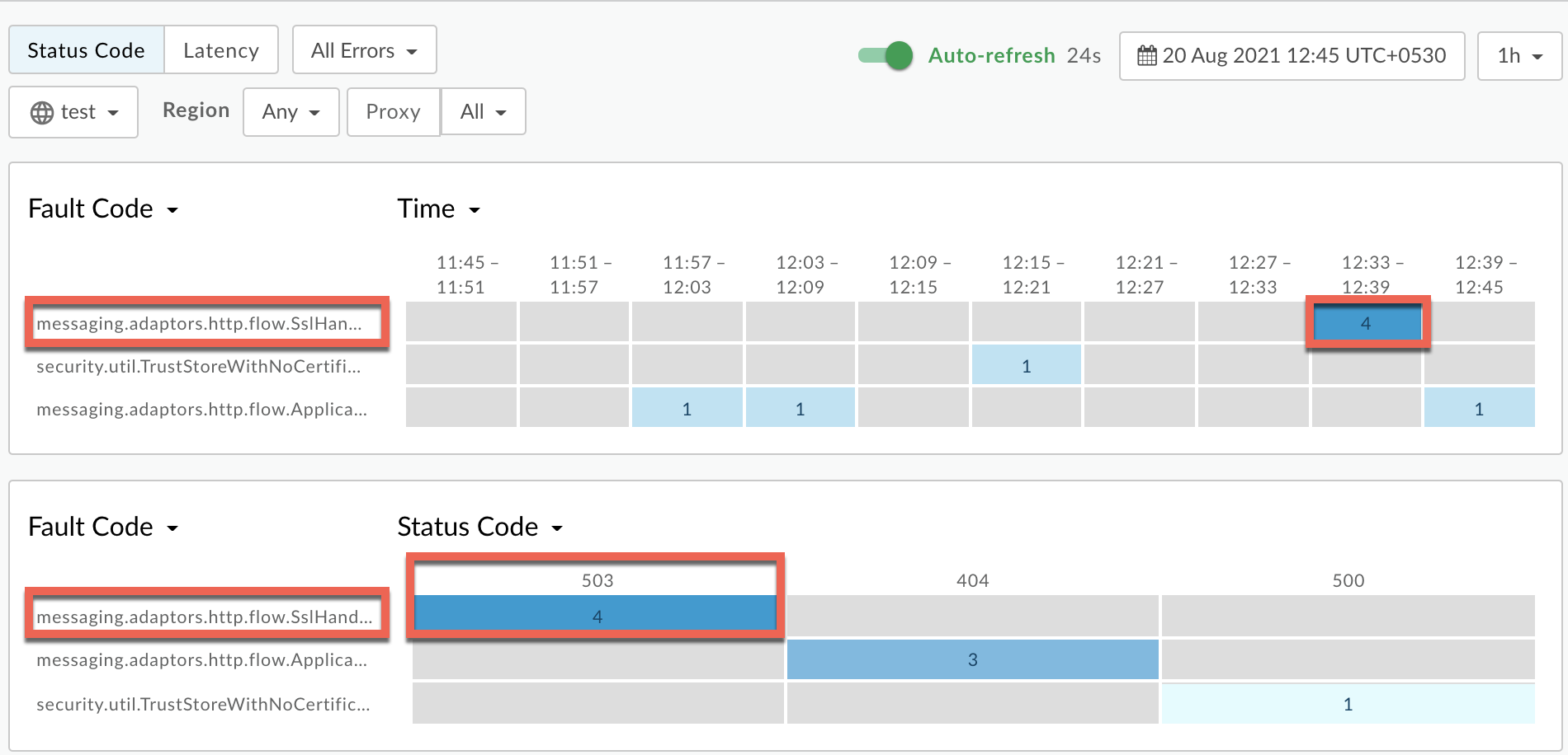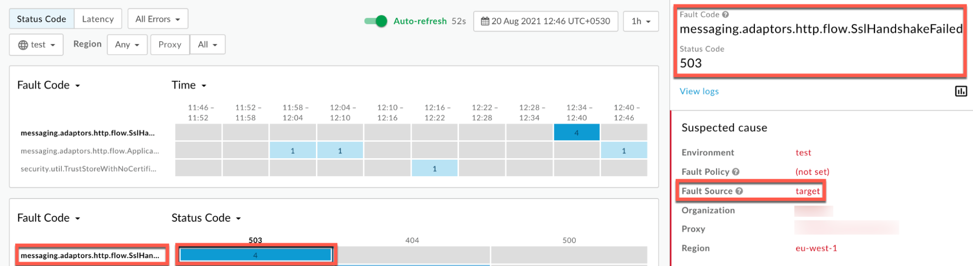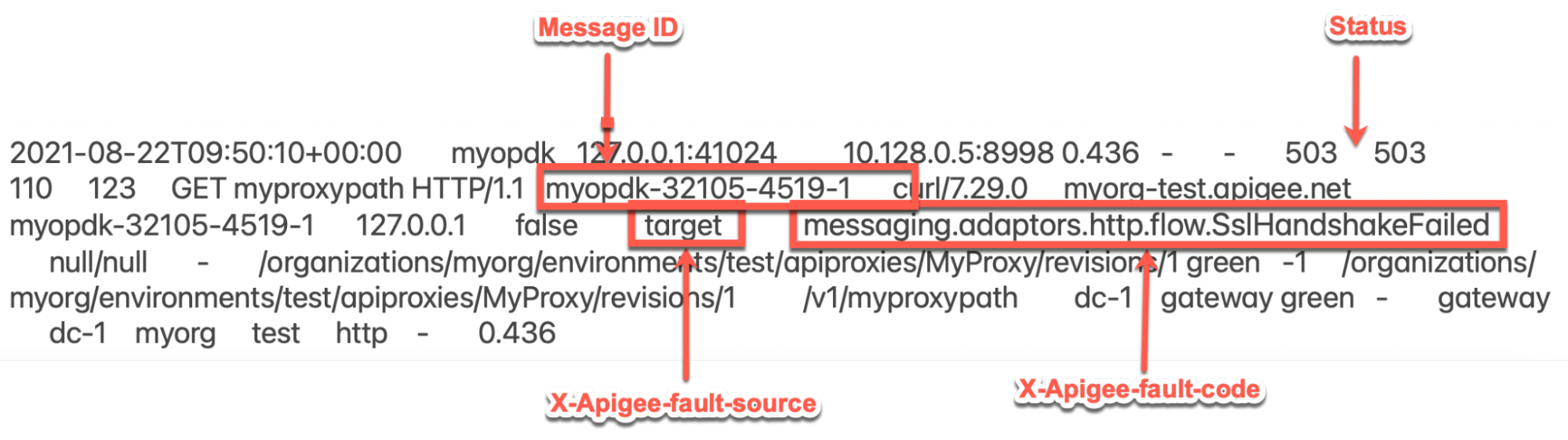 503エラーがないか検索します 特定の期間にmessaging.adaptors.http.flow.SslHandshakeFailed( または、まだ503で失敗しているリクエストがあるかどうか。 X-Apigee-fault-code と一致する