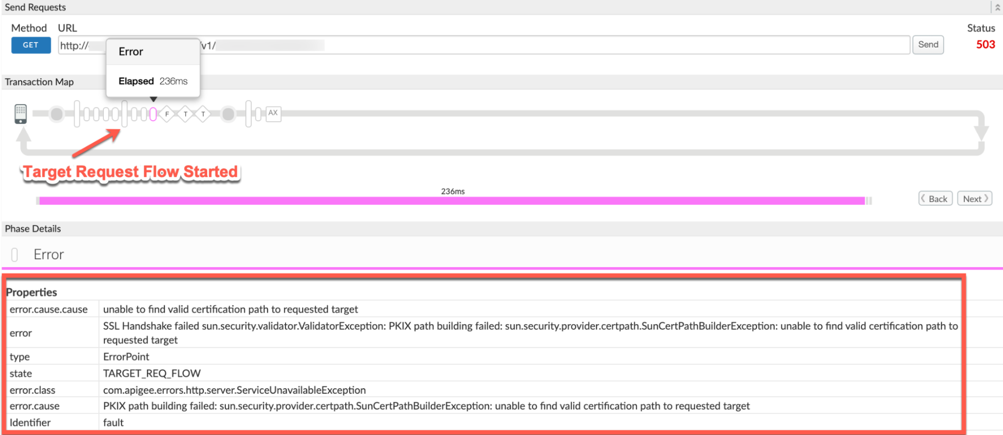 このエラーは通常、Target Request Flow Started フェーズの後に表示されます。 次のように指定します。