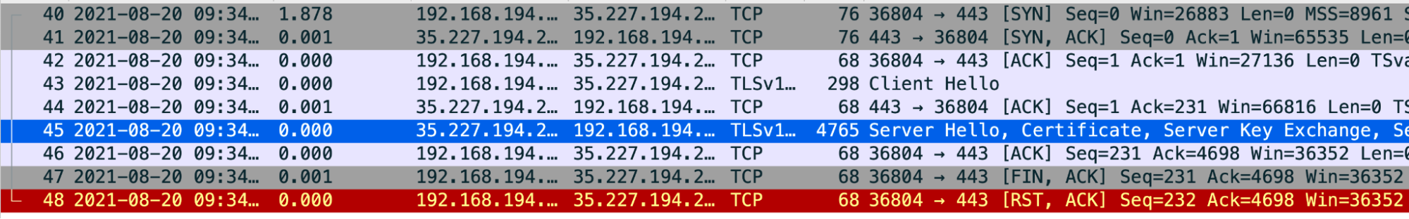 opensslコマンドの出力:openssl s_client -connect BACKEND_SERVER_HOST_NAME:PORT_#- バックエンド サーバーでキャプチャされた TCP/IP パケット