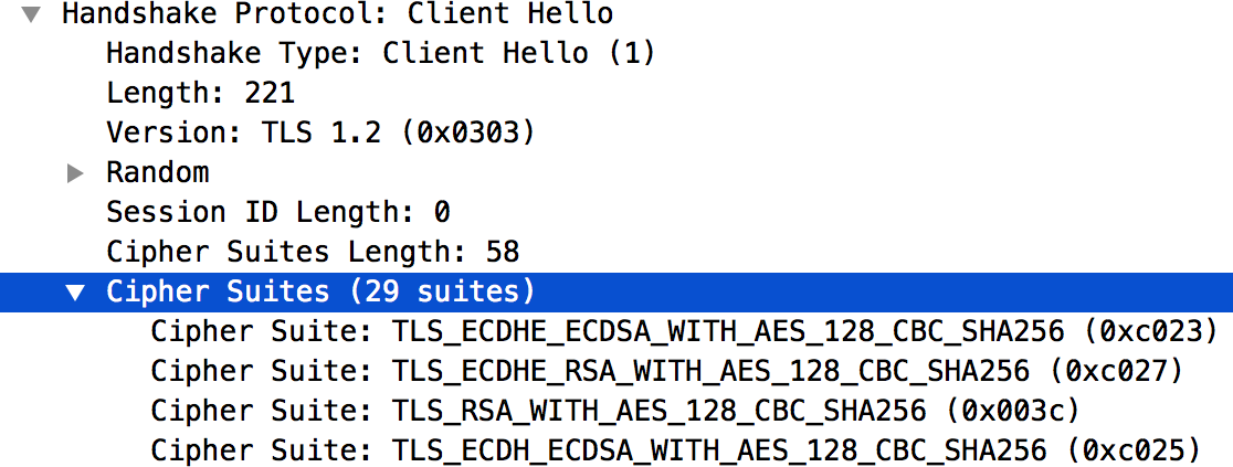 tcpdump輸出內容中的訊息 #4 列出了用戶端支援的加密套件演算法 應用程式,如下所示: