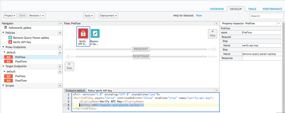 - Edite o proxy de API. Selecione Desenvolver > Proxies de API > helloworld_apikey e acesse a visualização Develop.