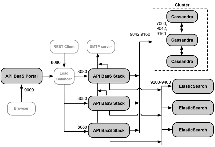 - Un'installazione in produzione di API BaaS utilizza un bilanciatore del carico tra il nodo del portale API BaaS e i nodi dello stack BaaS API. Durante la configurazione del portale e le chiamate API BaaS, specificare l'indirizzo IP o il nome DNS del bilanciatore del carico, non dei nodi dello stack.