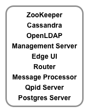 Dalam skenario ini, satu host menjalankan server mandiri Gateway dan komponen terkait — Apigee Management Server, Apache ZooKeeper, Apache Cassandra, OpenLDAP, Edge UI, Apigee Router, dan Apigee Message Processor. Host lainnya menjalankan komponen mandiri Analytics, yaitu Qpid Server dan Postgres Server.