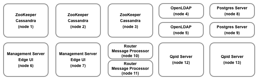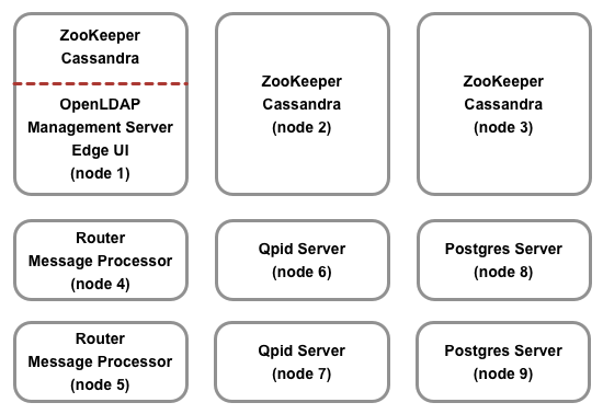 Dalam skenario ini, tiga pembawa acara menjalankan gugus ZooKeeper dan Cassandra. Salah satu dari tiga host tersebut juga menjalankan Apigee Management Server, OpenLDAP, dan Edge UI. Dua dari tiga host tersebut juga menjalankan Apigee Router + Message Processor. Dua host menjalankan Apigee Analytics.