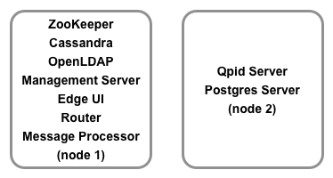 Neste cenário, um único host executa os servidores autônomos de gateway e os componentes associados: servidor de gerenciamento da Apigee, Apache ZooKeeper, Apache Cassandra, OpenLDAP, interface de borda, roteador da Apigee e processador de mensagens da Apigee. O outro host executa os componentes independentes do Analytics: Qpid Server e Postgres Server.