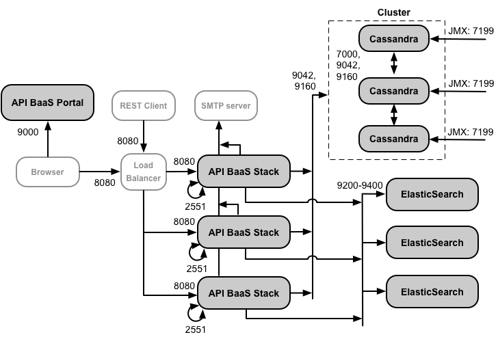 - Uma instalação de produção do API BaaS usa um balanceador de carga entre o nó do portal da API BaaS e nós de pilha de BaaS da API. Ao configurar o portal e fazer chamadas de API BaaS, você especifique o endereço IP ou o nome do DNS do balanceador de carga, e não dos nós da pilha.