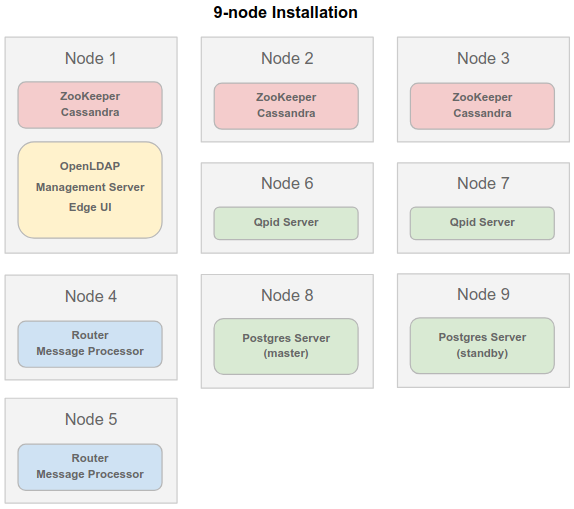 이 시나리오에서는 단일 노드가 게이트웨이 독립형 서버 및 관련 구성요소를 실행합니다. Apigee 관리 서버, Apache 동물원, Apache Cassandra, OpenLDAP, Edge UI, Apigee Cloud Router, Apigee 메시지 프로세서입니다 다른 노드는 애널리틱스의 독립형 구성요소인 Qpid를 실행합니다. 서버 및 Postgres 서버.