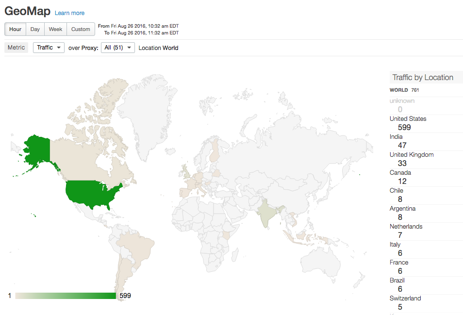 Le aggregazioni geografiche funzionano mediante l'estrazione di dati geografici da un database di terze parti e l'aggiunta ai dati di analisi raccolti da Edge. Le informazioni geografiche possono contenere città, paese, continente, fuso orario e regione di una richiesta effettuata a un proxy API.