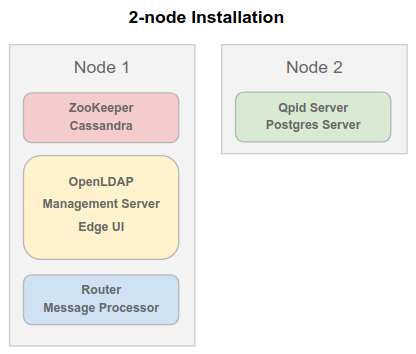 In diesem Szenario werden auf einem einzelnen Knoten eigenständige Gateway-Server und zugehörige Komponenten ausgeführt: Apigee Management Server, Apache ZooKeeper, Apache Cassandra, SymasLDAP, Edge-UI, Apigee-Router und Apigee Message Processor. Auf dem anderen Knoten werden eigenständige Analytics-Komponenten ausgeführt: Qpid-Server und Postgres-Server.