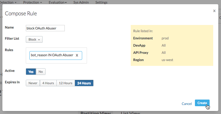 만들기를 클릭하여 Apigee Edge로 규칙을 전송합니다.